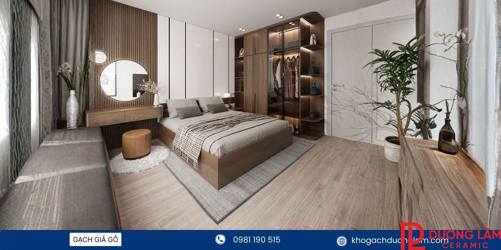Phòng ngủ thường phù hợp với kiểu lát thẳng hoặc lát so le nhẹ. Những cách lát gạch men phòng ngủ này giữ bố cục gọn, dễ vệ sinh và ít lỗi mốt, dịu mắt khi nhìn lâu. Với gạch giả vân gỗ, lát xương cá hoặc lát dọc theo chiều dài phòng giúp không gian có chiều sâu hơn. Tránh các kiểu lát phức tạp vì dễ làm rối nền.